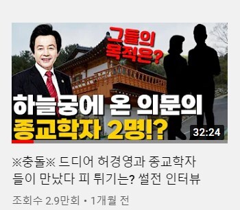 썸네일에서, “의문의 종교학자”는 자기들 입장에서 제멋대로 붙인 제목. 방문 목적 밝히고 사전에 협의된 인터뷰였다. 중년 남성 두 명이므로 남녀의 실루엣도 허위. 그냥 이야기 듣는 자리에 가까웠으므로 “충돌”은 없었다. 피튀길리도 없다. 그저 좋은 분위기에서 만나는 데 의미가 있는 자리였다. 정작 영상 내용은 크게 문제될 것 없다. 블러 처리해준 것도 배려해준 것이고. 나는 반대편에 앉아있어 화면에 나오지 않는다. 그리고 영상 내용은 허 총재의 종교에 대한 견해가 잘 요약된 부분이므로 볼 만은 하다.