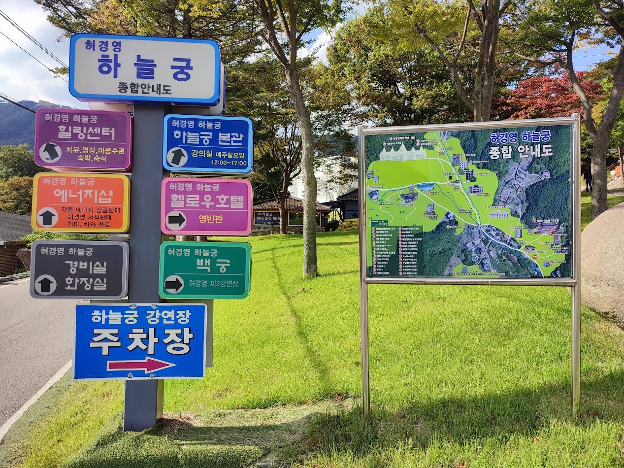2. 하늘궁은 양주시 장흥면 일대에 한창 조성 중이었다. 두리랜드에서 북쪽으로, 장흥관광지를 통과해 산골짜기 깊은 곳에 다다르면 하늘궁 세계가 펼쳐진다. ‘초종교 하늘궁’에서는 2016년에 현재 본관으로 사용하는 한옥 건물에서 강연을 연 이래, 주변 지역 건물과 토지를 활발히 매입하고 건물 신축을 준비 중이다. 전해 듣기로는 13,300여 평에 달하는 넓은 지역이고, 이 권역은 확대되리라 예상된다. 건설 예정인 공터와 매입한 이전 건물들이 눈에 들어온다. 현재 사용 중인 건물(제3관) 외에 본관(제1, 제2)은 공터이다. 그런데 공간이 주는 느낌은 공사장이기보다는 꽤 낭만적이다. 시설은 완비되어 있지 않지만 시설의 위치를 안내하는 표지판은 예쁘게 만들어져 있다. 본관 공터 한쪽 구석에는 소원을 들어준다는 소원석이 있어 신도들의 방문을 기다리고 있다. 그 옆에는 카페와 기념품 판매점이 있다. 공터는 잔디가 입혀져 있고, 총재가 어린 시절 구상했다는 하얀색 궁전 그림이 크게 걸려있다. 아직 건물은 없어도 성지 역할은 이미 하고 있음이 느껴진다. 또 이곳에서 매입한 건물은 ‘스튜디오’나 ‘영상 강의실’처럼 나름의 역할을 부여받은 곳도 있으나, 호텔이나 모텔 모습 그대로인 곳도 많아 이색적이다. 호텔 간판 위에 ‘하늘궁’ 간판만 추가해서 된 ‘하늘궁 네오호텔’, ‘하늘궁 헬로우호텔’, ‘하늘궁 스카이호텔’ 등이 병풍처럼 성지를 둘러싸고 있다. 이곳들은 지금도 방문객들을 위해 호텔로 운영된다고 한다.